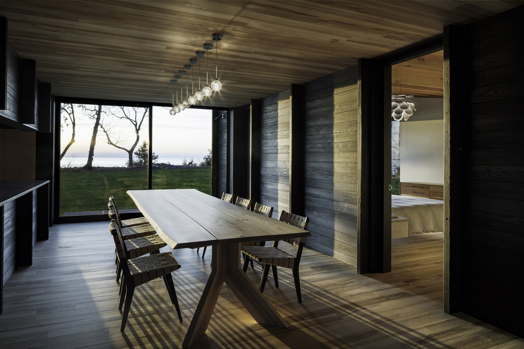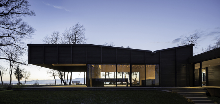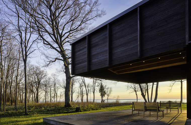 暴露在外的木梁擺放位置使得整個(gè)室內(nèi)空間里的拱頂看起來(lái)并不對(duì)稱。在小木屋的南端,6米長(zhǎng)的懸梁屋頂延伸至觀景休息平臺(tái),屋頂為其提供了一種保護(hù),同時(shí)對(duì)密歇根湖和周圍的美景一覽無(wú)余。