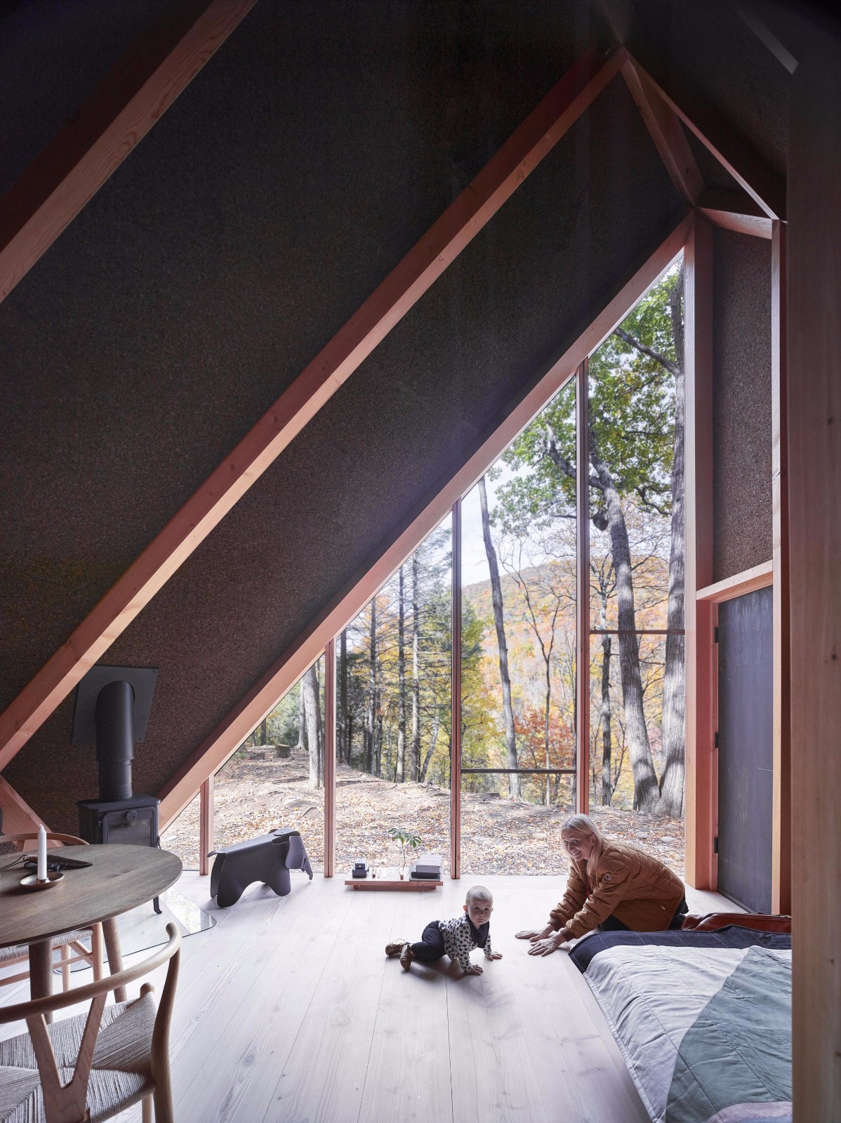 著名建筑事務(wù)所BIG在哈德遜河谷設(shè)計(jì)了一座帶有折角屋頂輪廓線的黑色小木屋。該建筑是預(yù)置住宅創(chuàng)業(yè)公司克萊因集團(tuán)的第一個(gè)設(shè)計(jì)模型。該原型住宅起名為A45,是克萊因集團(tuán)為業(yè)主提供的由著名建筑事務(wù)所設(shè)計(jì)的一系列微型住宅中的第一個(gè)。