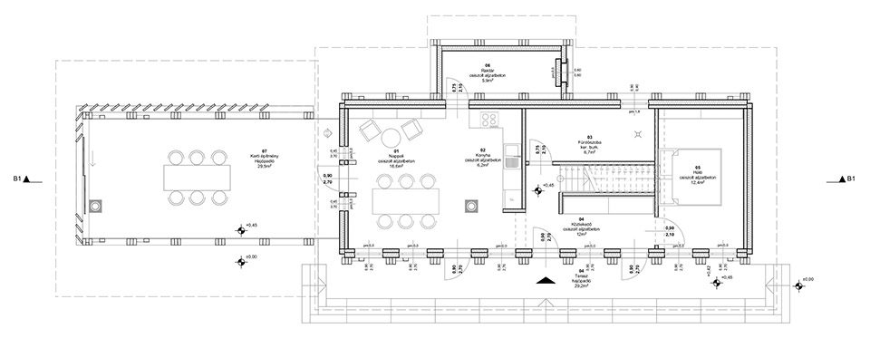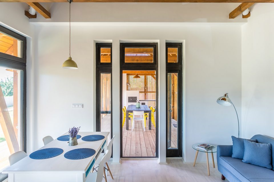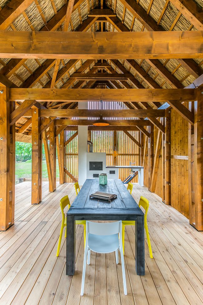 建筑采用自承重木結(jié)構(gòu),隔離墻放置在柱子之后。除外部露臺(tái)不設(shè)隔墻外,其自身結(jié)構(gòu)與建筑主體結(jié)構(gòu)并無二異。建筑設(shè)計(jì)充分遵循業(yè)主的設(shè)計(jì)要求,同時(shí)嚴(yán)格遵守Balaton丘陵地區(qū)的建設(shè)標(biāo)準(zhǔn)。
