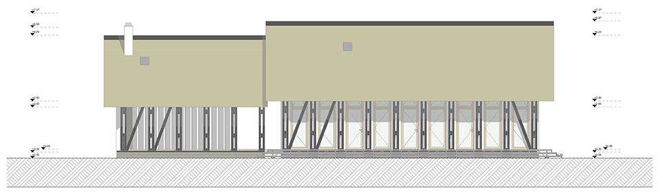 被強(qiáng)化的建筑結(jié)構(gòu)進(jìn)一步實(shí)現(xiàn)了度假屋的設(shè)計(jì)理念。以1.4米間隔成對(duì)出現(xiàn)的結(jié)構(gòu)柱式形成了建筑的主立面。玻璃門窗沿立面鋪設(shè),賦予了陽光足量的穿行空間,讓人的生活與自然環(huán)境充分接觸。