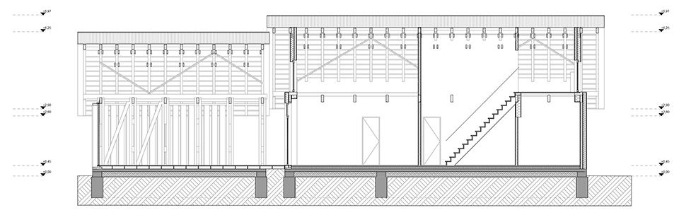 該建筑的形態(tài)設(shè)計(jì)和材料選擇均充分尊重了場地的周圍環(huán)境。設(shè)計(jì)師將傳統(tǒng)材料運(yùn)用與當(dāng)代設(shè)計(jì)手法之中,裸露可見的承重結(jié)構(gòu)形成富有韻律感的外立面,讓建筑彰顯與眾不同之處。
