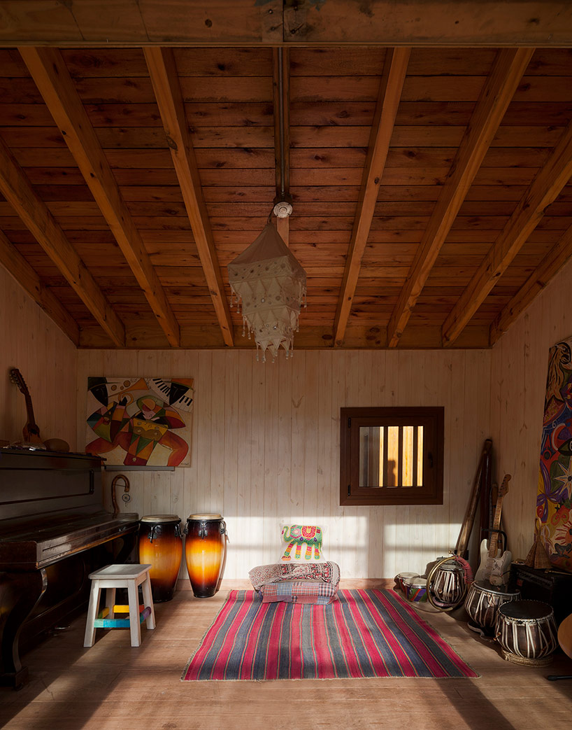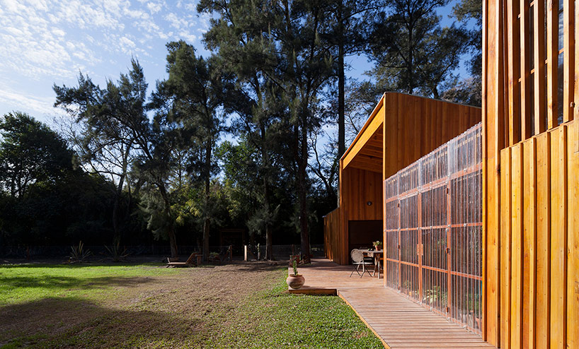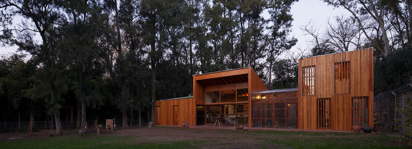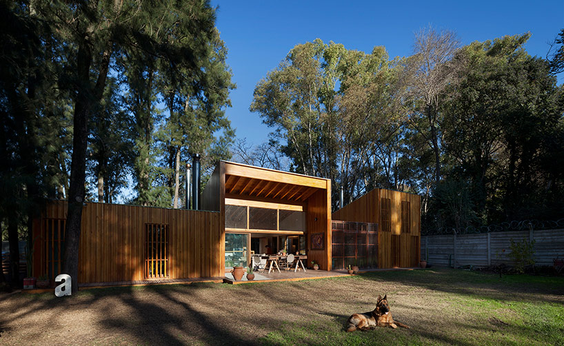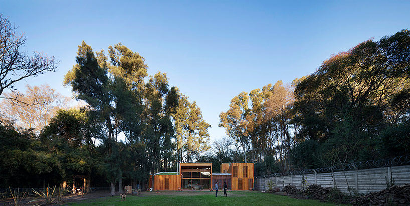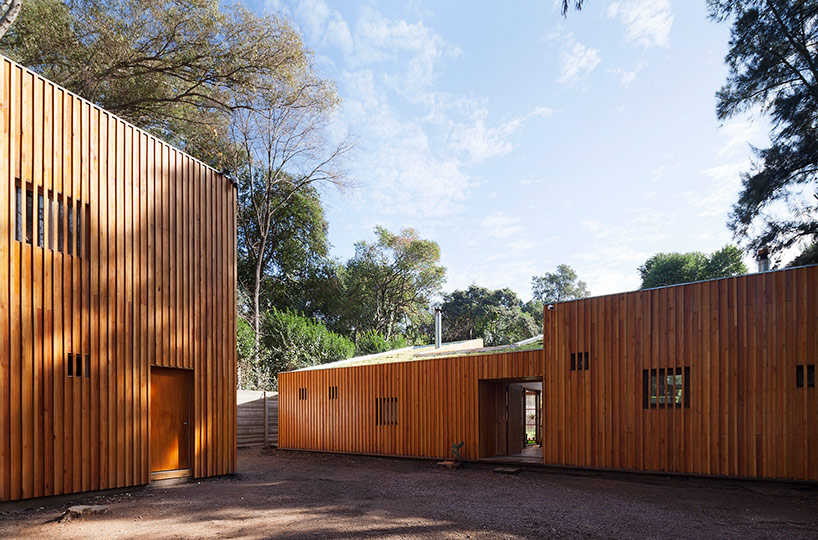 阿根廷建筑事務(wù)所IR arquitectura與我們分享的項(xiàng)目,是位于阿根廷布宜諾斯艾利斯(Buenos Aires)郊外托爾圖吉塔斯市(Tortuguitas)的 Casa Aa節(jié)能住宅。在這個(gè)養(yǎng)育著孩子的家庭住宅,家里明確地劃分出大人與小孩間的分隔,同時(shí)又融入樹(shù)木茂盛的場(chǎng)地環(huán)境中,擁有進(jìn)行室外活動(dòng)的空間和充沛的陽(yáng)光。波浪狀聚碳酸酯屋頂覆蓋下的半室外綠色庭院是個(gè)溫室和有頂花園空間,并與位于中心位置的矩形起居空間相鄰。共享的起居區(qū)和主臥擁有朝北最高的洞口,使能照射到的陽(yáng)光最大化,而建筑的外部形態(tài)因此被分割成四部分。上下交替的傾斜綠色屋頂提供了一個(gè)很好的天然熱絕緣體,還有助于替換建筑所占據(jù)的自然地被。