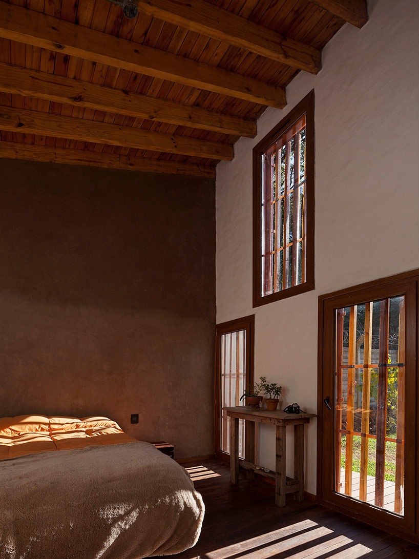 該建筑的木框架結(jié)構(gòu),基本是由從本地采購(gòu)的木材構(gòu)成,而承重墻在下方支撐著厚層壓木梁。外部隔板的壁柱間的凹陷空間,被填充成濕茅草泥土墻,與綠色屋頂共同作用為低能耗、高熱效的建筑表皮。除了起居室擁有開(kāi)闊視野和充沛光線的大面積玻璃窗之外,垂直排列的木板構(gòu)成的其余外立面共同形成了微妙的韻律感。百葉木條不斷延伸排列橫跨窗戶,既保證了私密性,也是自然光的過(guò)濾器。