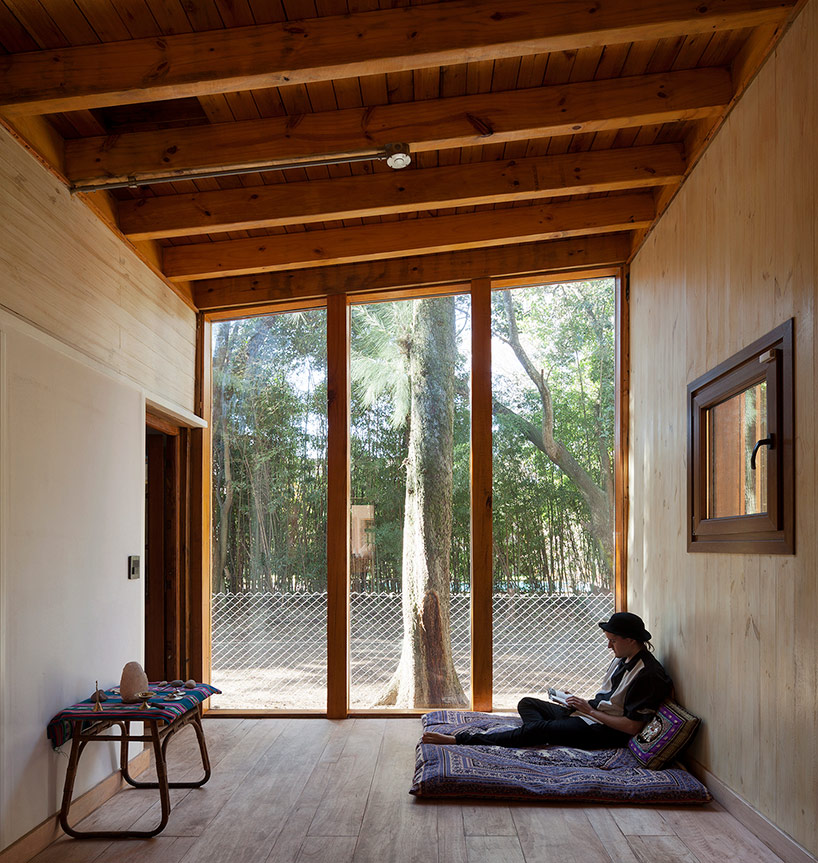 主臥的傾斜屋頂朝庭院呈開(kāi)放狀。