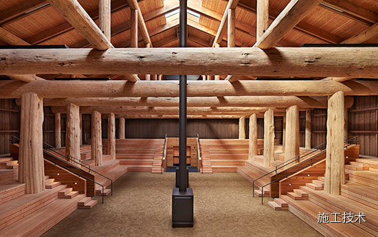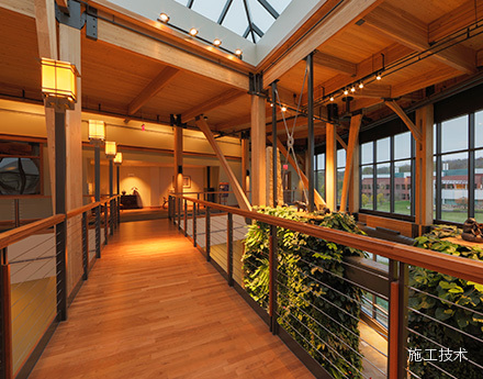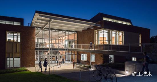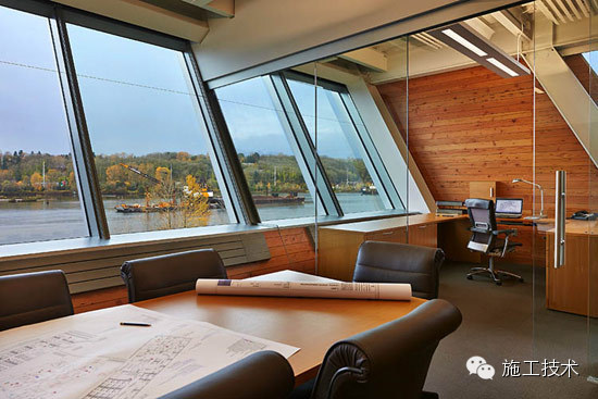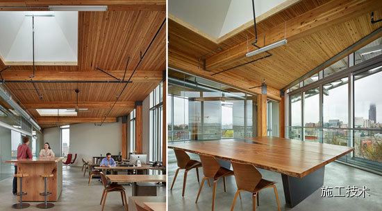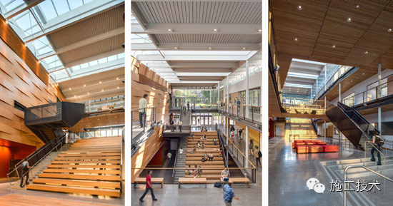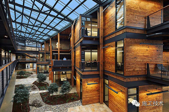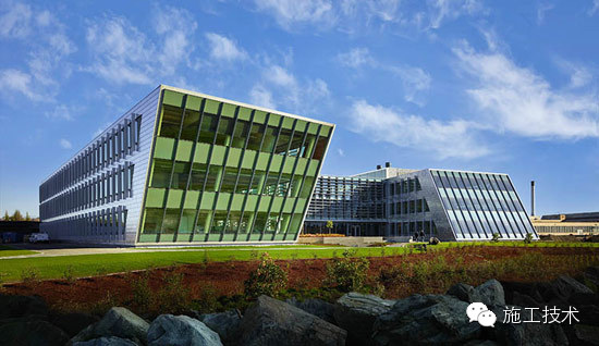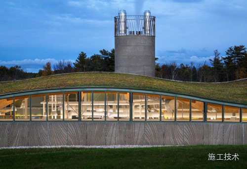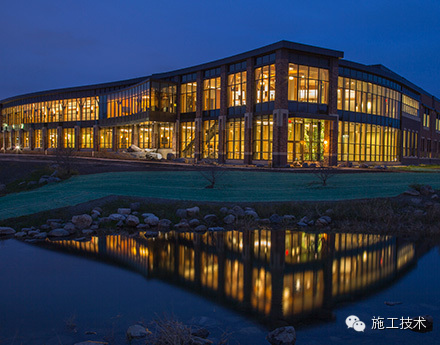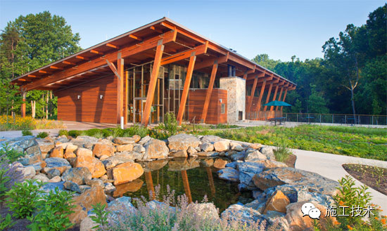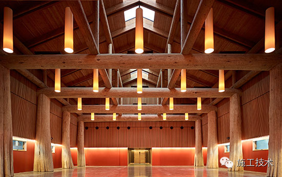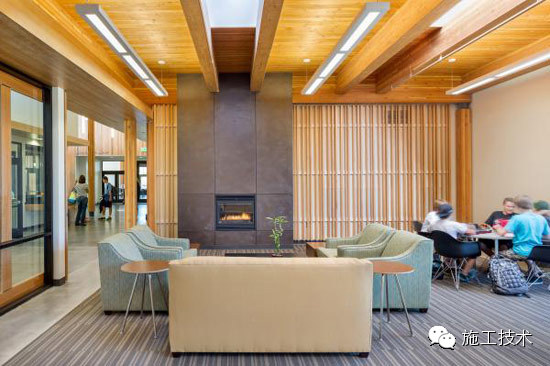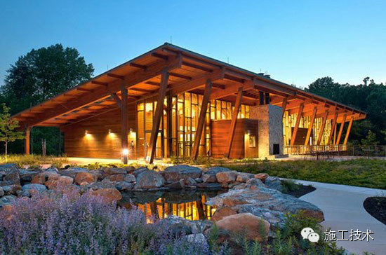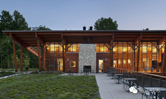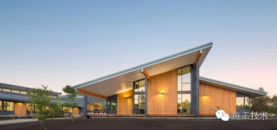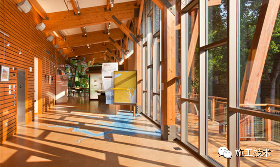 建筑物的桁架為膠合層壓板,從而優(yōu)化了這種可再生資源的結(jié)構(gòu)價值。膠合板消耗能源少于鋼筋混凝土或鋼材,可用于更長的時間跨度,可承受重負(fù)荷,并且擁有復(fù)雜 的形狀。該建筑通過了LEED環(huán)境保護(hù)認(rèn)證,包括一套可再生的膠合板結(jié)構(gòu)系、節(jié)水管道夾具、利用可回收的當(dāng)?shù)夭牧稀⑹覂?nèi)擁有豐富的自然光線以及高效的機械 系統(tǒng)、照明和外表皮。