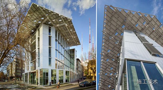 該建筑通過各種不同的系統(tǒng)達(dá)到以下這些目標(biāo),如一個高性能的建筑圍護(hù)結(jié)構(gòu);一個旨在優(yōu)化自然光的布局,估計有82%的中心空間將利用自然光采光。仔細(xì)與租戶 協(xié)調(diào),通過使用高效率的顯示器、復(fù)印機、筆記本電腦、零客戶端和基于云的服務(wù)器,以減少他們約75%的“插頭負(fù)載”。26孔、400英尺深的地源熱泵空調(diào) 系統(tǒng),將從地球收獲的能源來提供高效的加熱和冷卻,地板輻射系統(tǒng)將有效地加熱和冷卻辦公空間。242千瓦的屋頂太陽能光伏陣列將提供建設(shè)所需的所有凈能量。