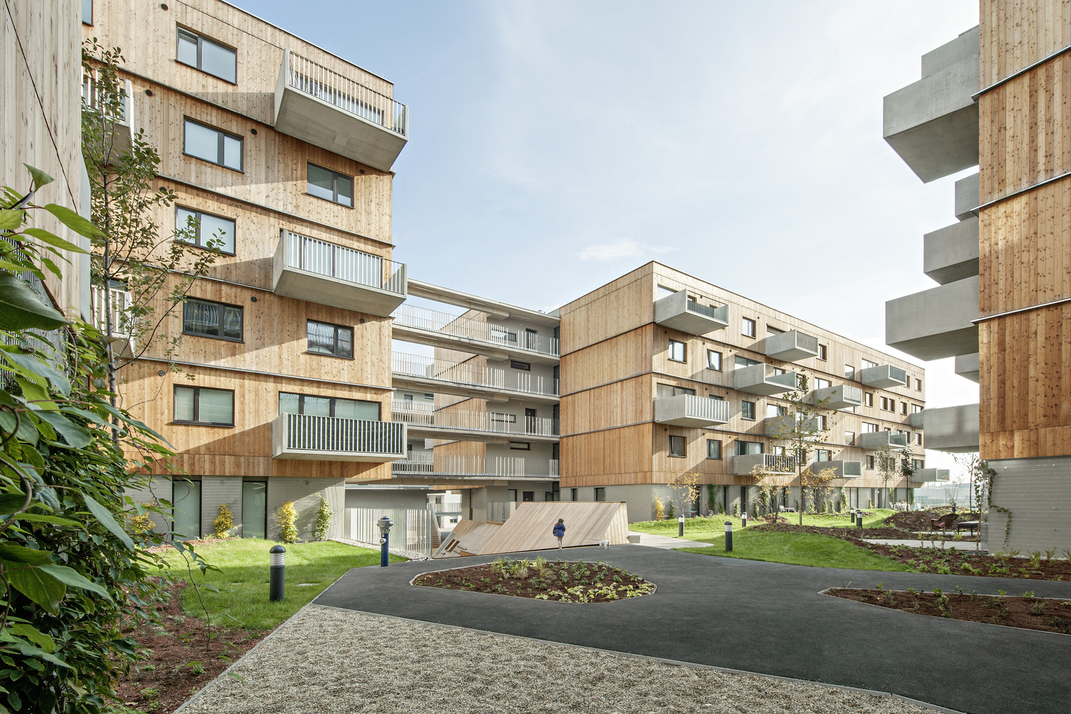 位于Seestadt Aspern東南部的大型建筑地塊D12,是一系列建筑體量相似,但規(guī)模不同的建筑。該建筑群共有213套公寓和8個(gè)商店,是由一組清晰可辨的獨(dú)立木制房屋組成,其形式為細(xì)長、緊湊的獨(dú)立體量。錯(cuò)落有致的布局創(chuàng)造了不同類型的庭院式空間和各種視覺關(guān)系。