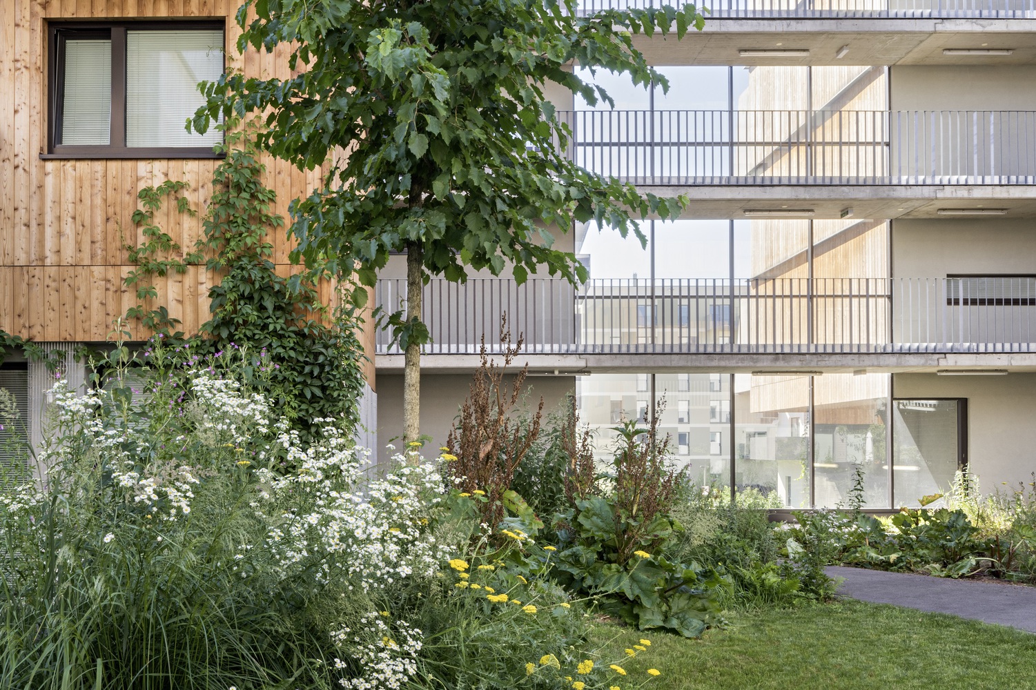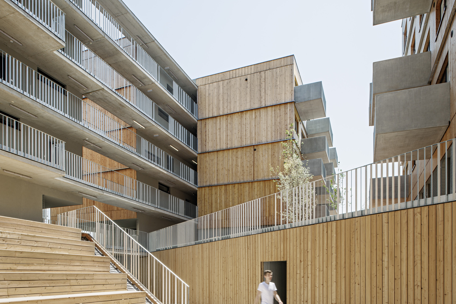 各個(gè)部分通過三排南北方向的通道平臺(tái)相互連接。這三條流通路線通過一系列采光樓梯、內(nèi)部走廊和開放的通道平臺(tái),提供了不同的空間體驗(yàn)。串行的線性基本結(jié)構(gòu)為布置不同類型的公寓提供了極大的靈活性,因此允許居民的交流。公寓平面圖的設(shè)計(jì)非常靈活。它們可以在以后以各種方式改變。盡管它們有一個(gè)很好的能源平衡,但建筑仍然向外開放。結(jié)合使用木材作為建筑材料,使整個(gè)建筑群既輕盈又有深度。