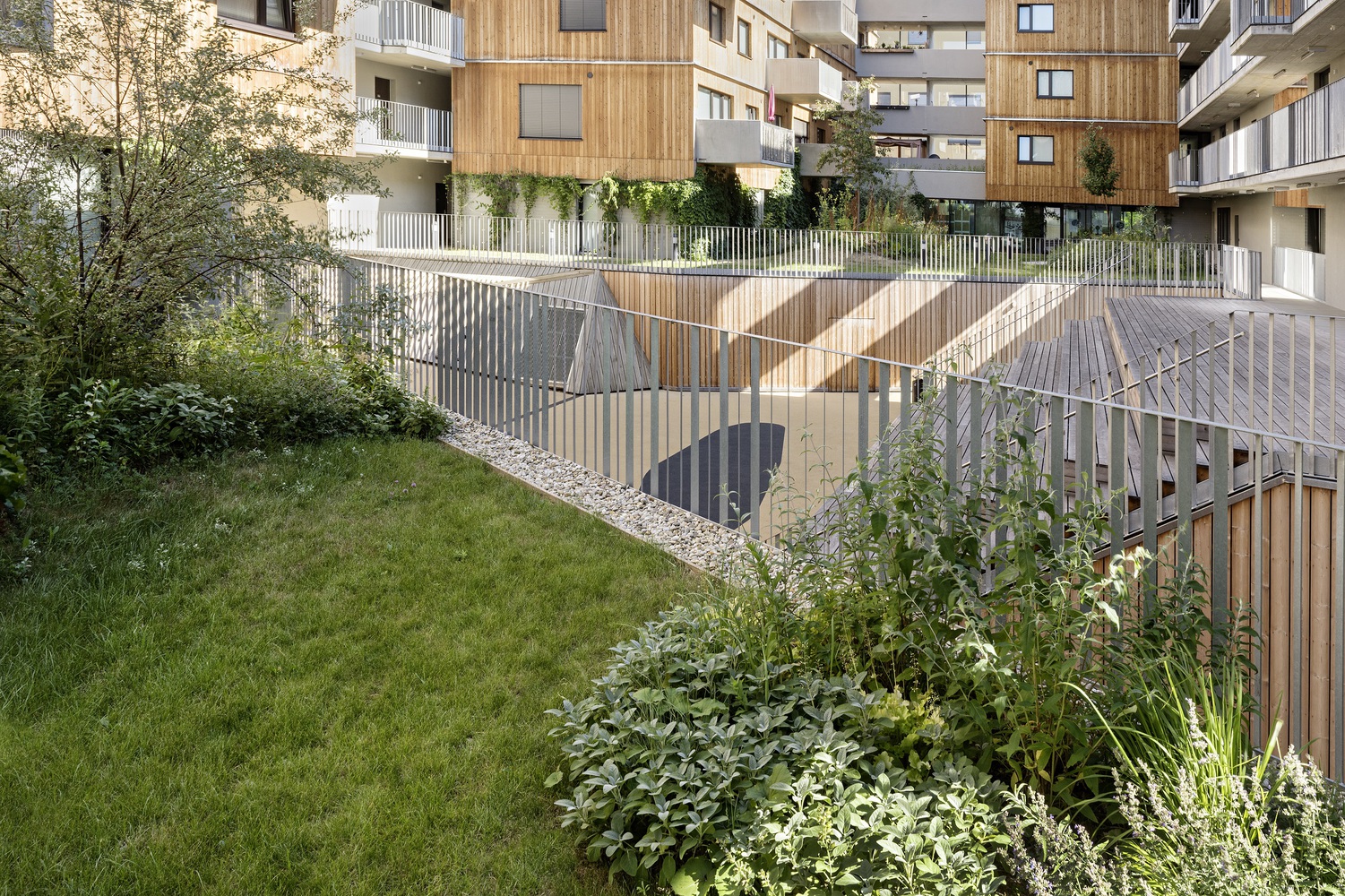 綠色的庭院與一些長滿青草的小山丘一起,形成了一個(gè)有機(jī)的景觀,這些庭院的翼形梯田有意地凸顯在中央庭院的中間。山丘、樹木和帶小樹冠的灌木遮擋了私人露臺(tái)。通往丘陵景觀的道路網(wǎng)絡(luò)被刻意限制,以防止走廊式路線的發(fā)展。在入口區(qū)、洗衣房和兒童游樂場前的路口形成了聚會(huì)場所。