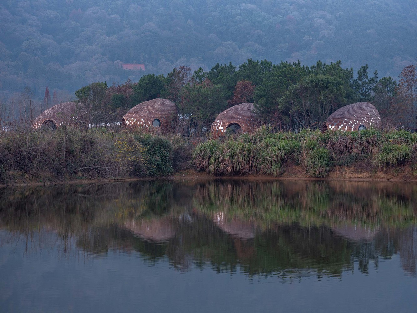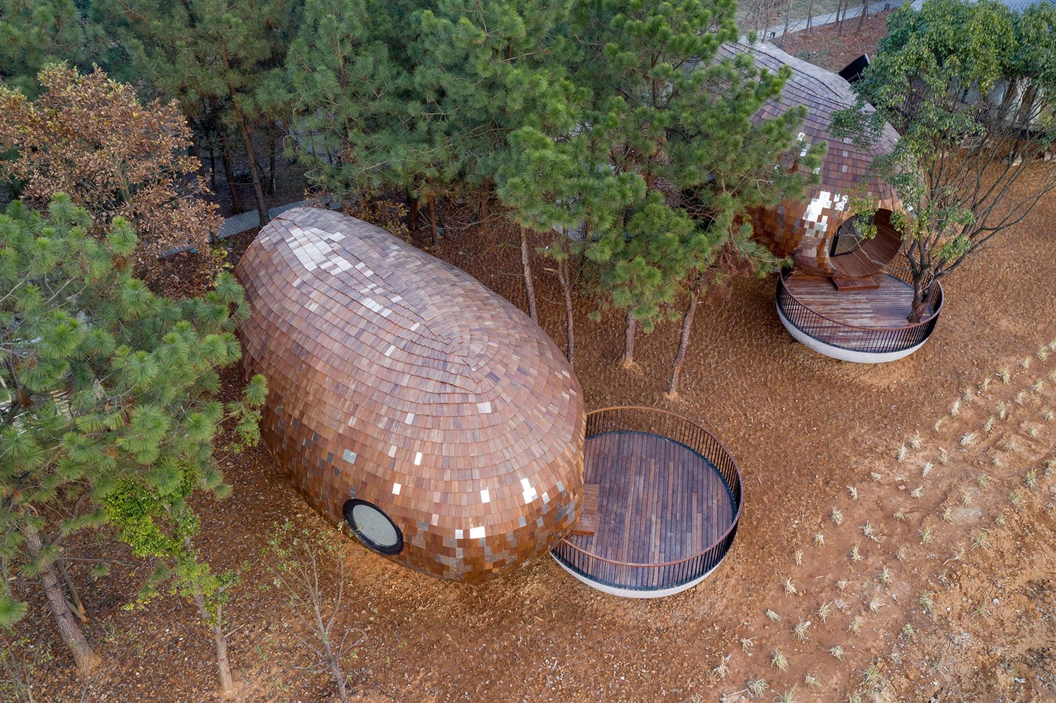種子木屋整體呈橢球形,底部采用鏡面鋁板,往高處漸變?yōu)槟就?。鏡面鋁板隨著季節(jié)、天氣的變化,反射周?chē)沫h(huán)境和氛圍,冬季時(shí)是紅土地,春夏季時(shí)是綠植,潮濕時(shí)是氤氳霧氣,晴天時(shí)是明媚陽(yáng)光。鏡面鋁板是種子屋落地生根的部分,上部的木瓦則使建筑逐漸回歸自然柔和的本質(zhì)。