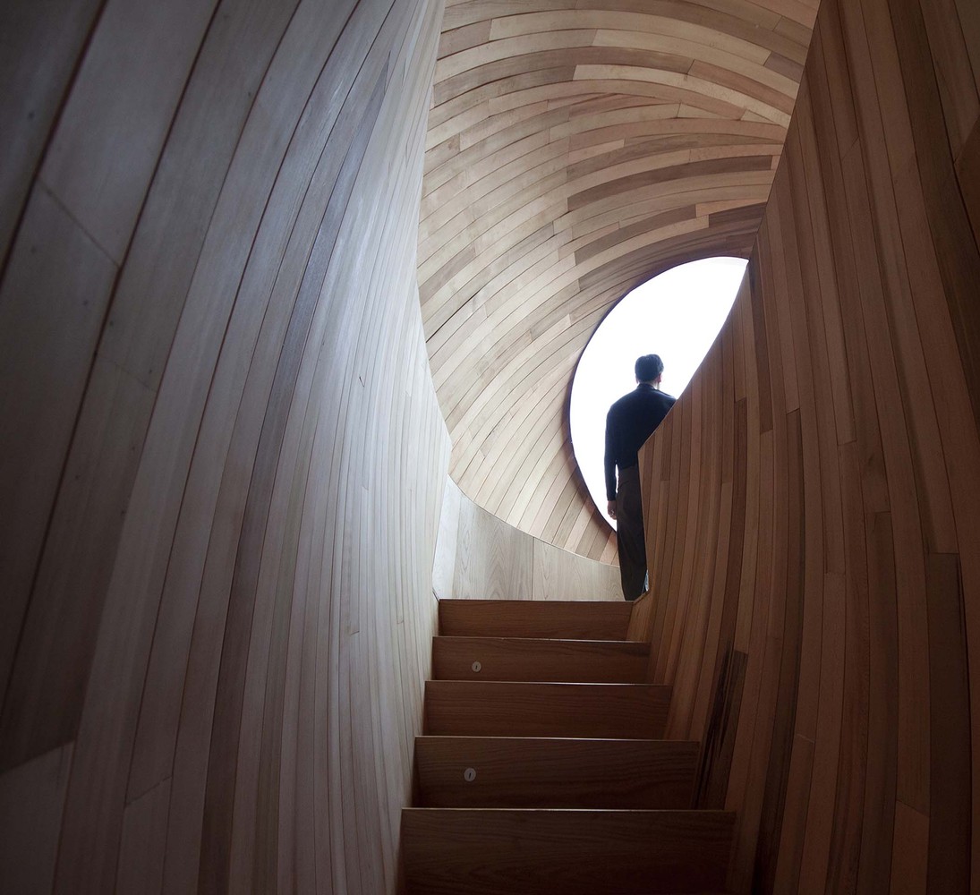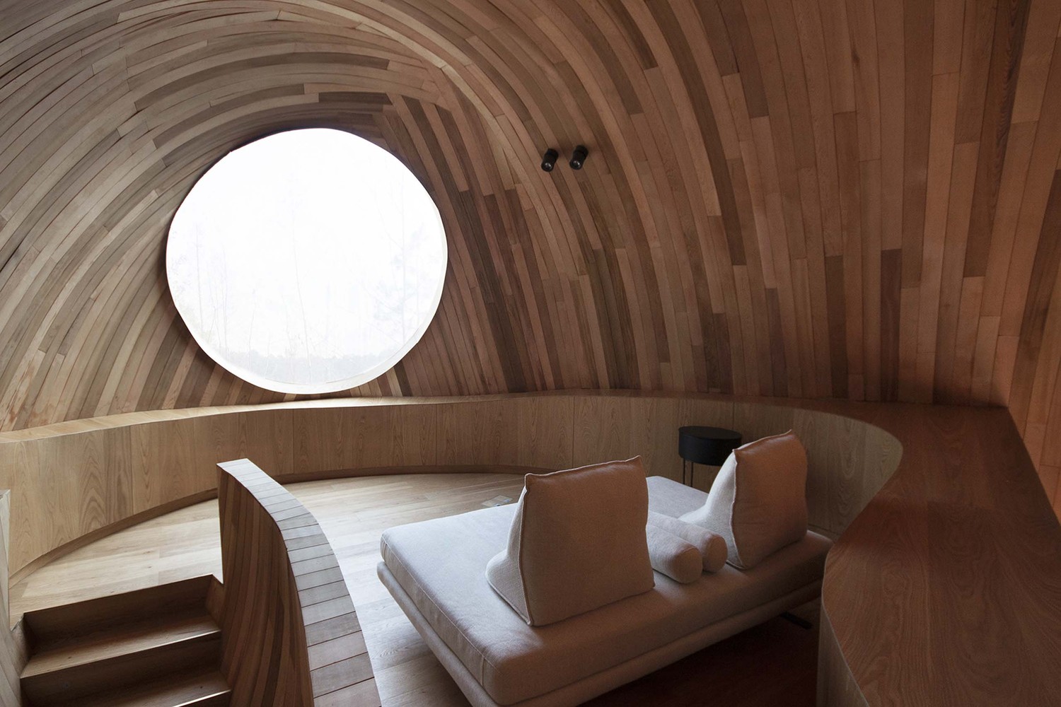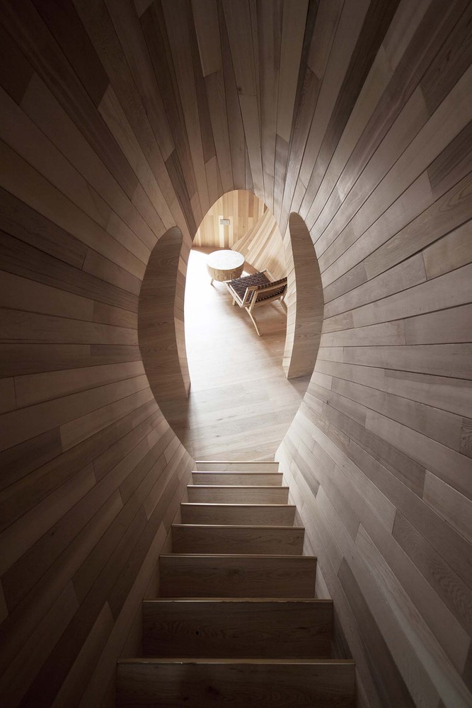 種子屋室內(nèi)墻面采用統(tǒng)一的木拼,自然的木色變化形成的條紋感,進(jìn)一步強(qiáng)調(diào)橢球形態(tài)的空間感。主臥后側(cè)體量容納入口、衛(wèi)浴、儲(chǔ)藏等功能區(qū),同時(shí)形成親子區(qū)閣樓。閣樓與一層通過(guò)一個(gè)插入式的橢圓柱型樓梯間連接,同時(shí)樓梯間與入口空間穿插,形成有趣的異形空間。