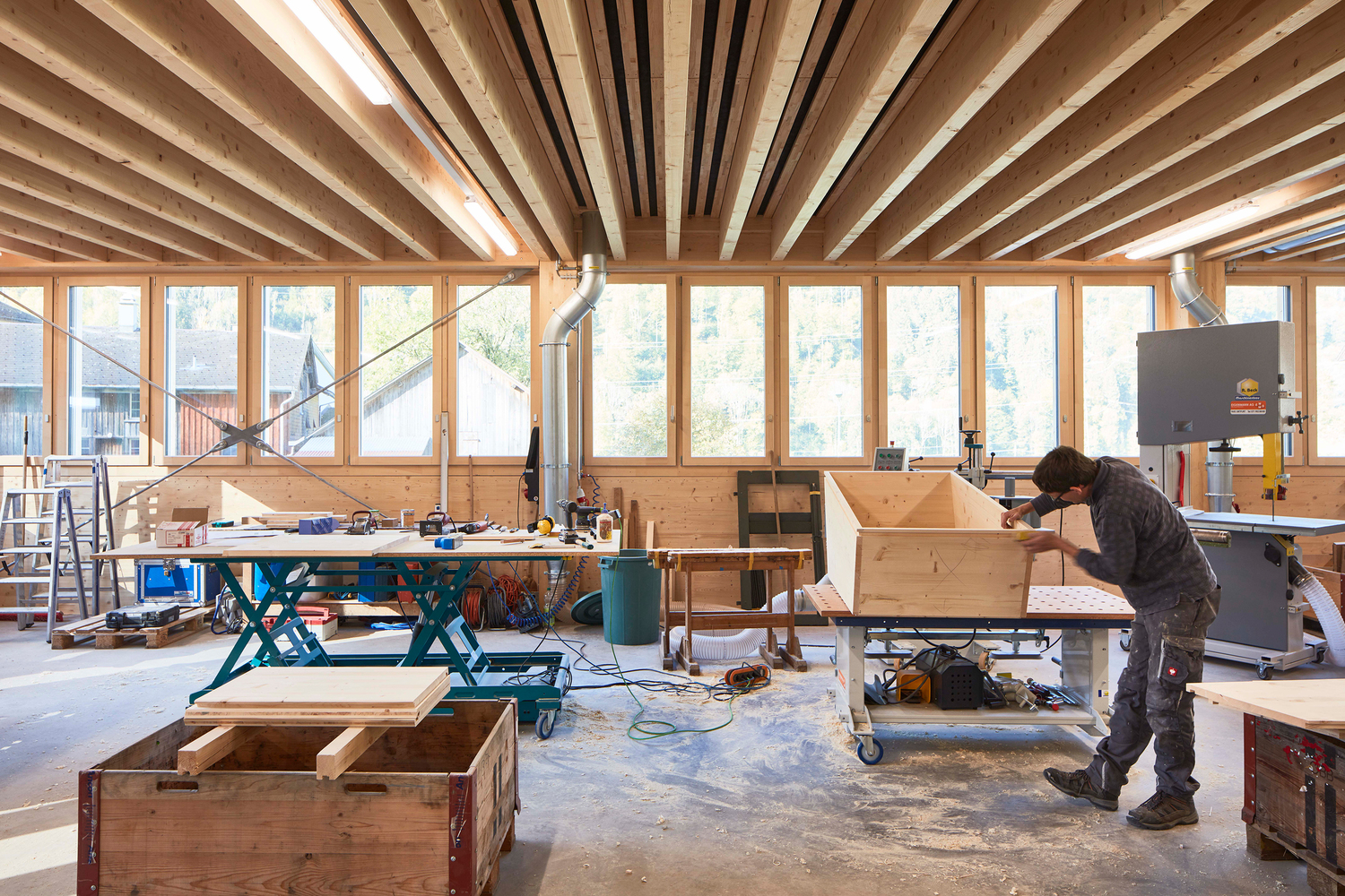 這是位于瑞士一個叫做Matt小村莊中心的一座木屋,在一場大火燒毀了原始生產(chǎn)設(shè)施后,木結(jié)構(gòu)建筑公司新的一座替代建筑。新的大廳與舊的大廳很相似,但是建筑整體的建造缺融入了很多新的思考。木材因其無限的可能性而被選為主要的建筑材料。