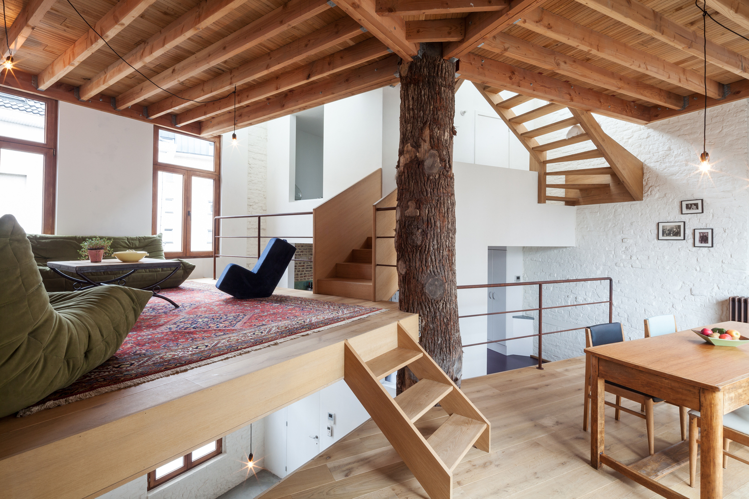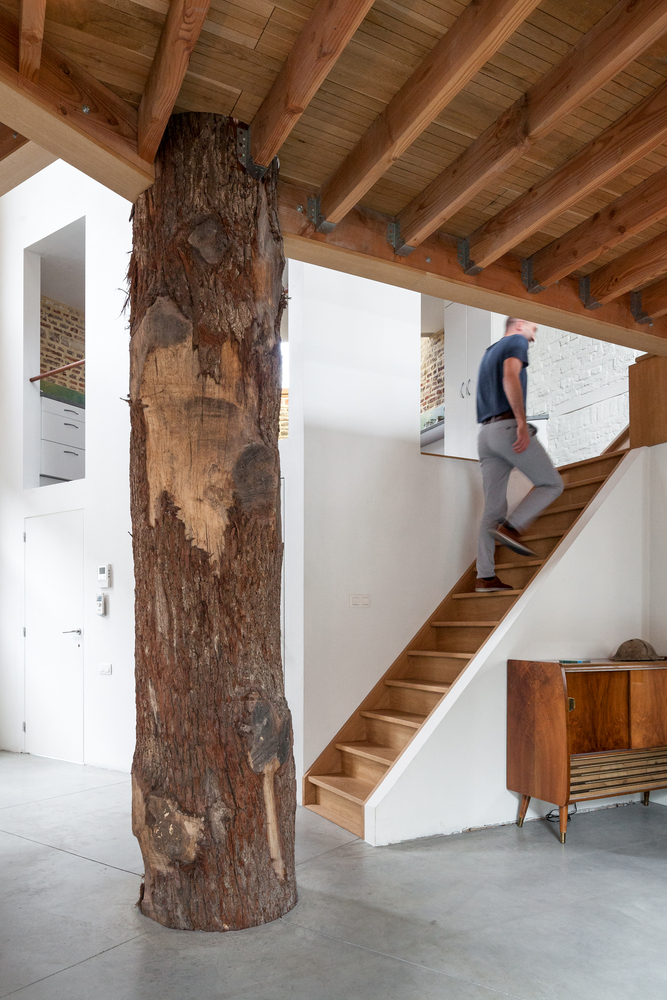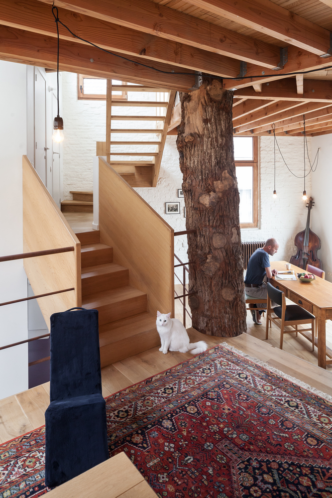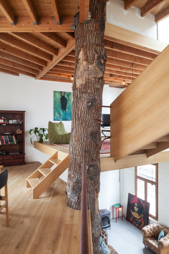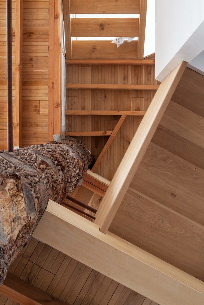 一段橡樹樹干被放置在五邊形平面正中間,作為新的支撐結(jié)構。新的上層樓層懸掛在原有外墻和中心支柱之間,呈螺旋式上升。這樣就在生活區(qū)域內(nèi)創(chuàng)造出沒有任何內(nèi)墻的開放室內(nèi)空間。樹干中柱是一個合乎邏輯且經(jīng)濟實惠的解決方案,它立即為新居所帶來了合適的氛圍。衛(wèi)生間、廚房、入口和儲藏室/洗衣房都設置在縱貫上下的封閉體塊中。