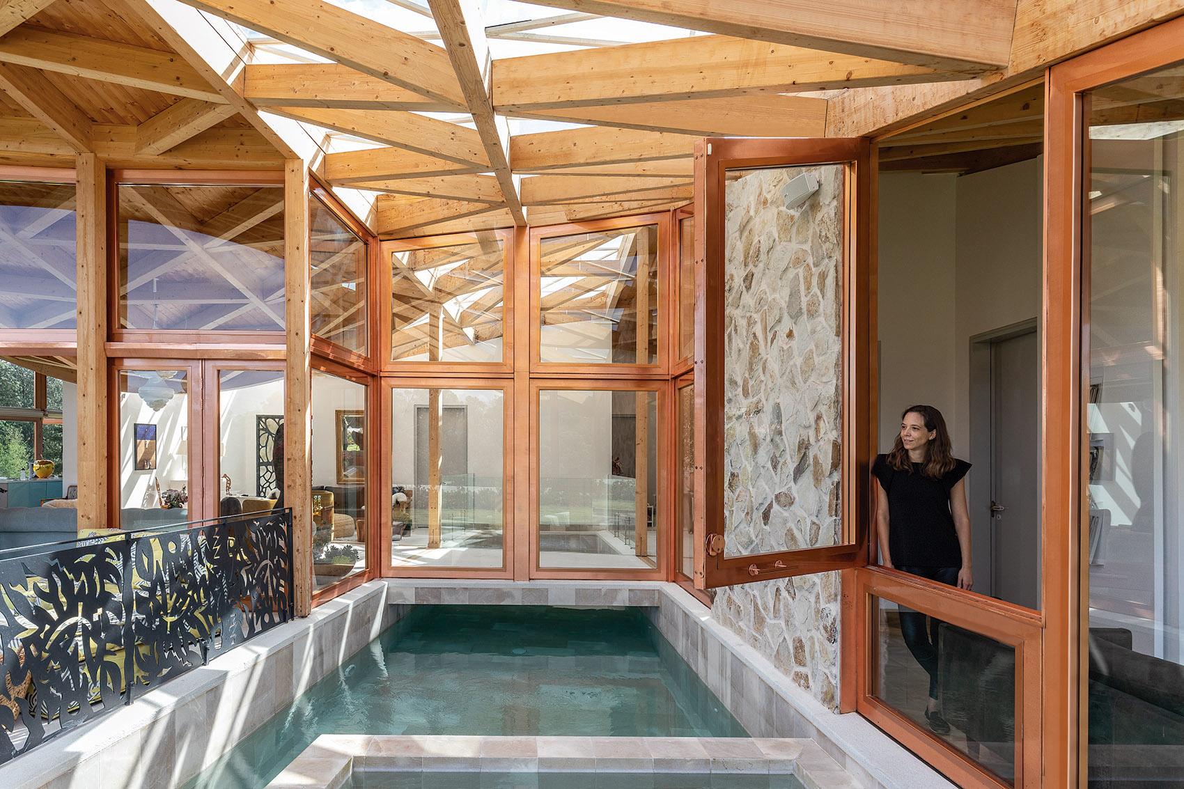 在室內,一處位于平面中央的縫隙空間將住宅明確地劃分為社交空間和私人空間兩部分,同時也在形式上保留了“莊園住宅”的傳統(tǒng)布局。天窗照亮了室內外水池與中央交通空間,同時創(chuàng)造出交叉通風與拔風效應,以綠色的生物氣候策略營造出舒適的室內體感環(huán)境。