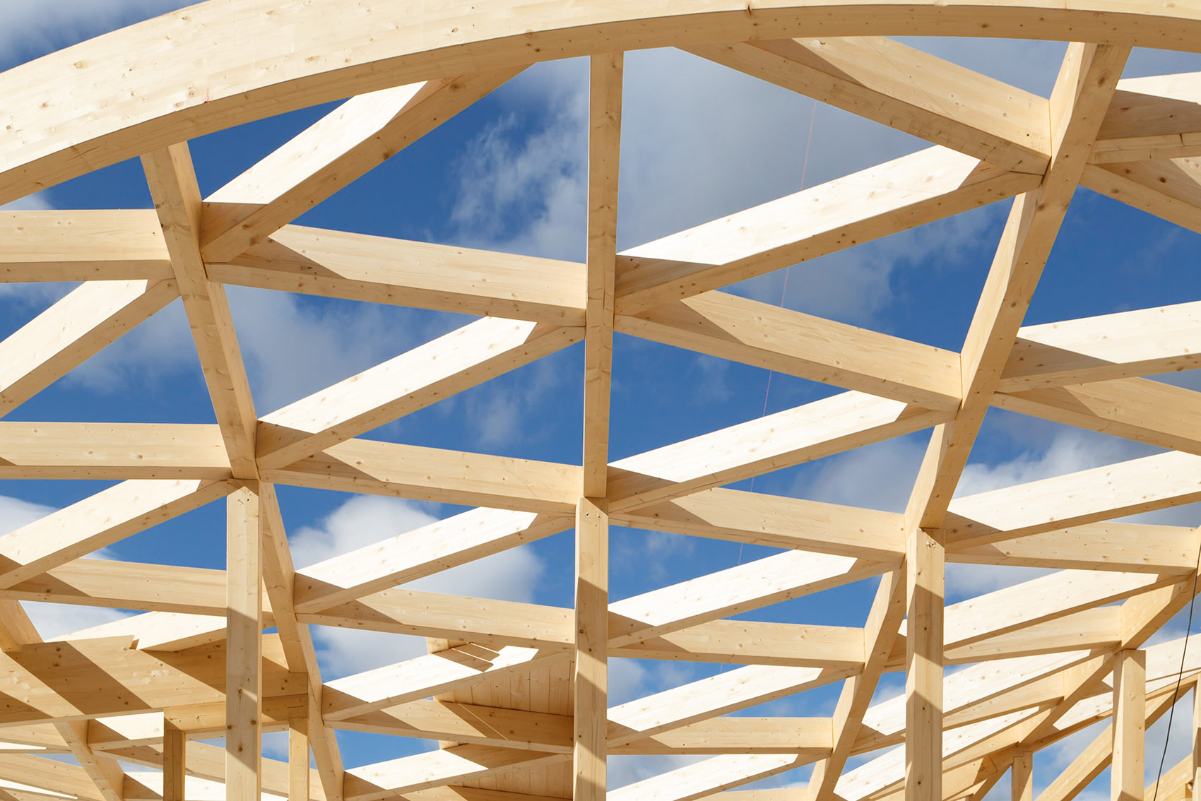 項目中的每一塊木頭都采用了自動化機器精確地切割和制造,進而在組裝時創(chuàng)造出一幅完美匹配的拼圖。疊層梁和曲線梁以相同的半徑重復,為屋頂塑造出不同的折疊效果。結構的三角劃分方式創(chuàng)造了高效的組裝流程,同時也十分便于運輸。建筑飾面采用了當?shù)夭牧?,如石材、瓷磚等,帶有銅色涂層的鋼窗則是由本地工匠手工制作而成的。